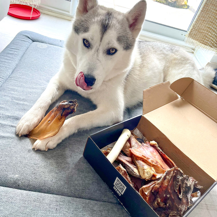 This box includes beef skin, beef trachea, pork shoulder bones, buffalo tibia bones, beef knuckles, beef tails, lamb legs, moon bones, pig ears and beef ears.