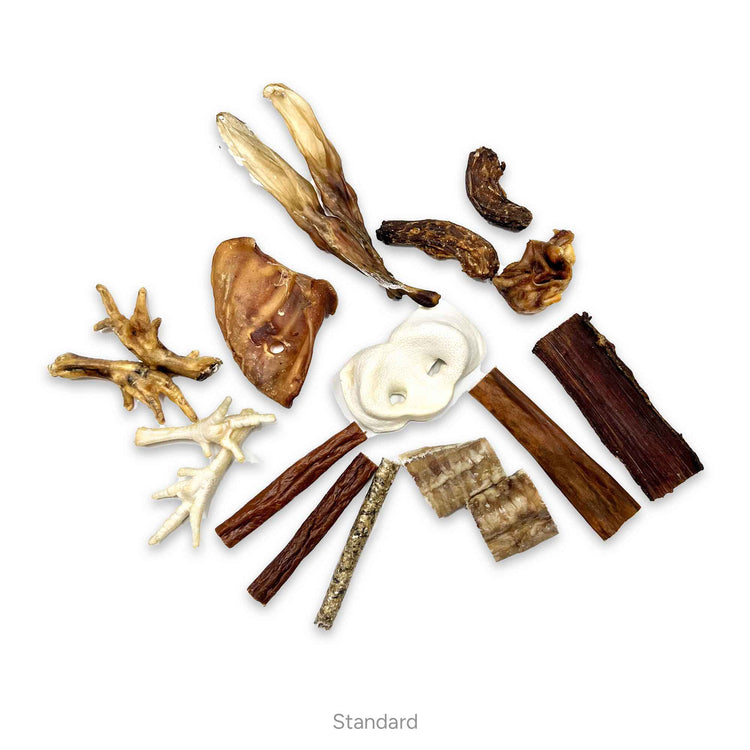 Abhängig von Ihrem Hund ist jede Box so konzipiert, dass sie einen Monat lang natürliche Leckerlis und Kauartikel enthält.